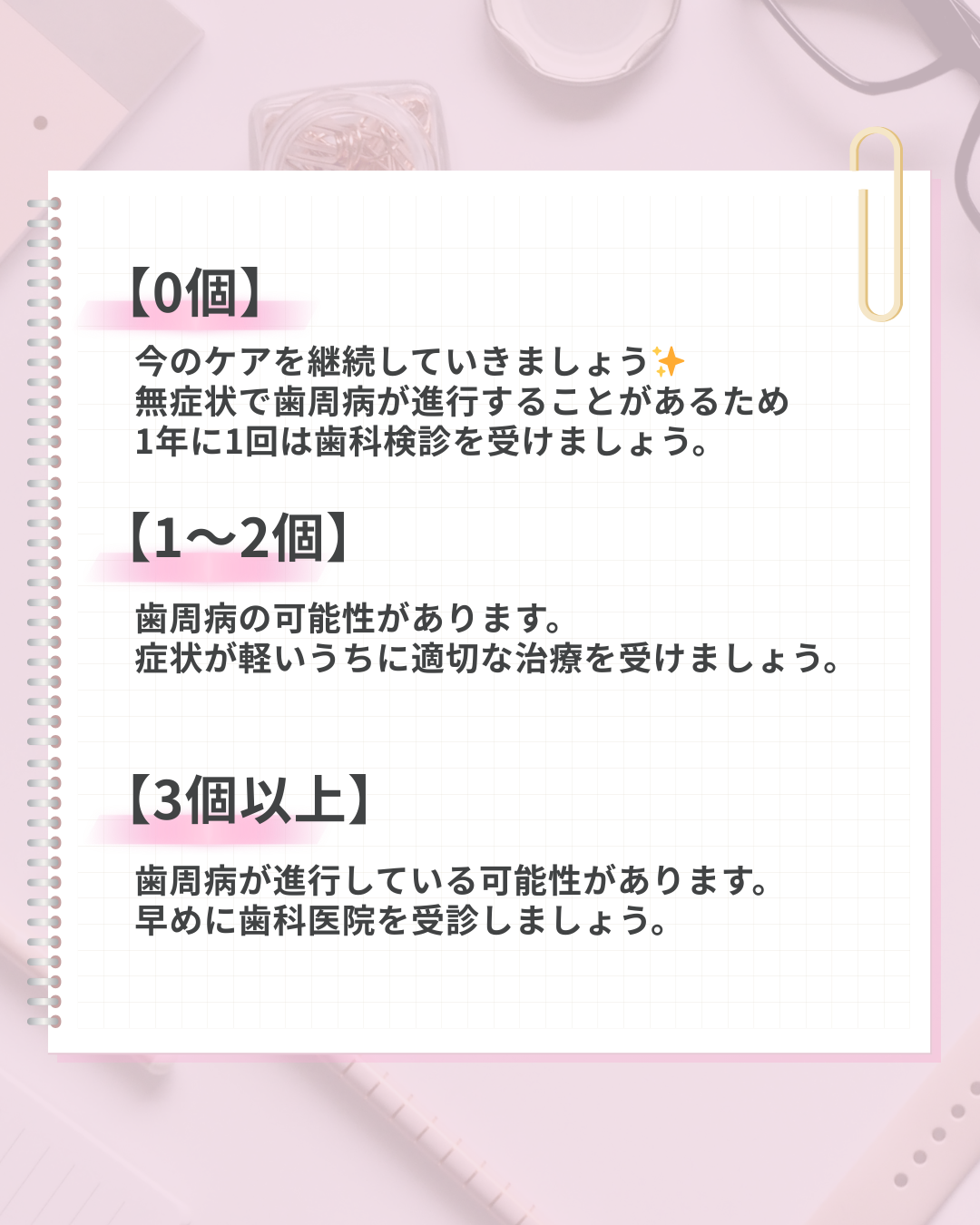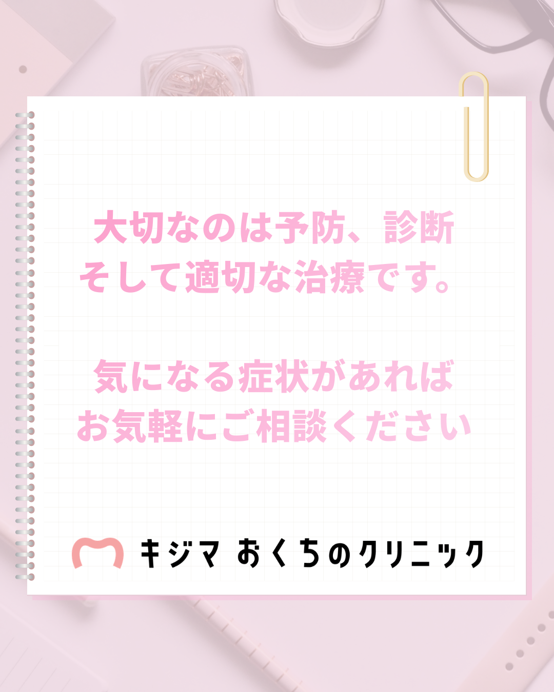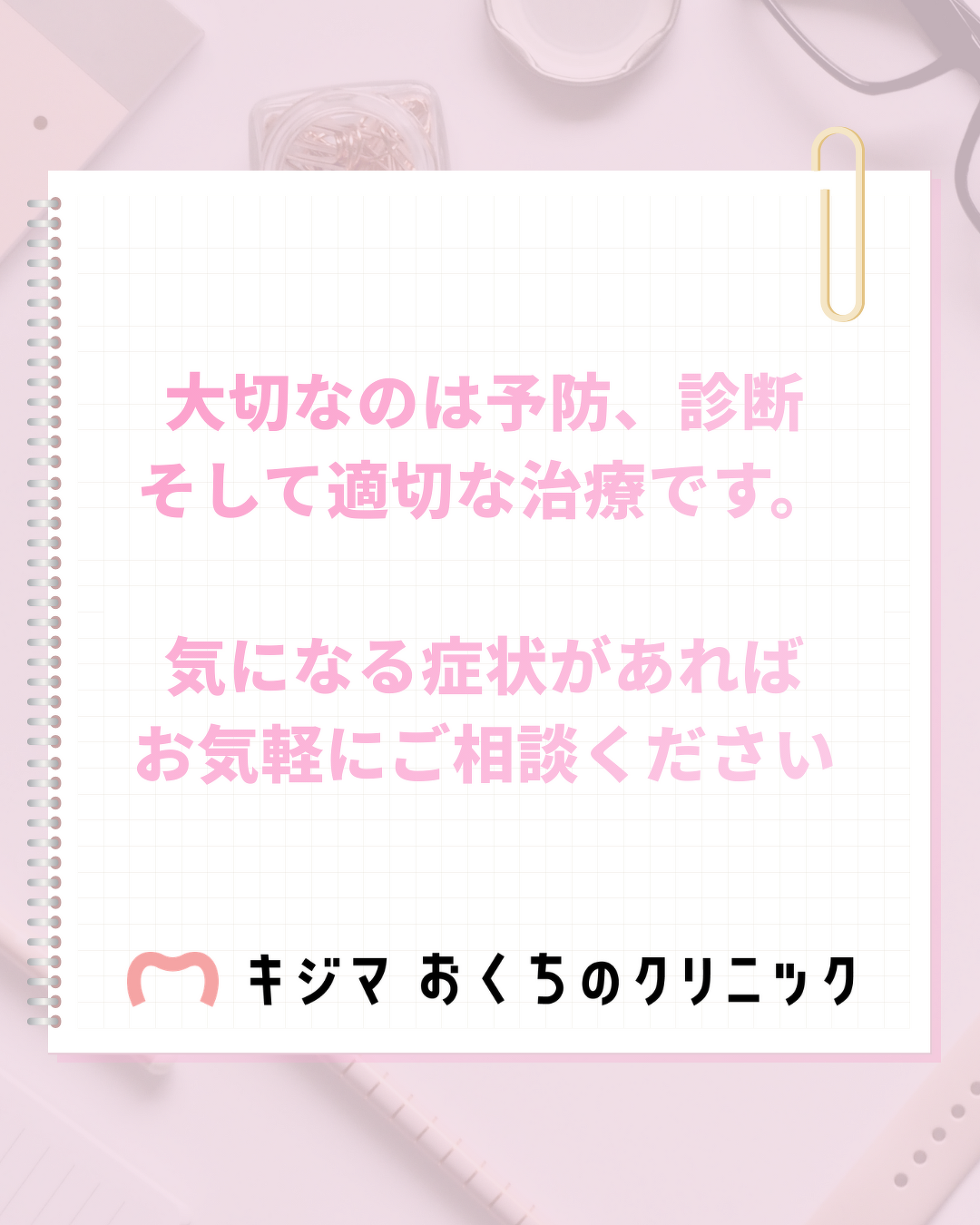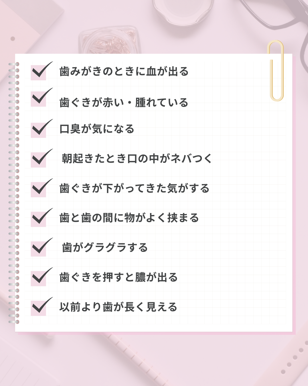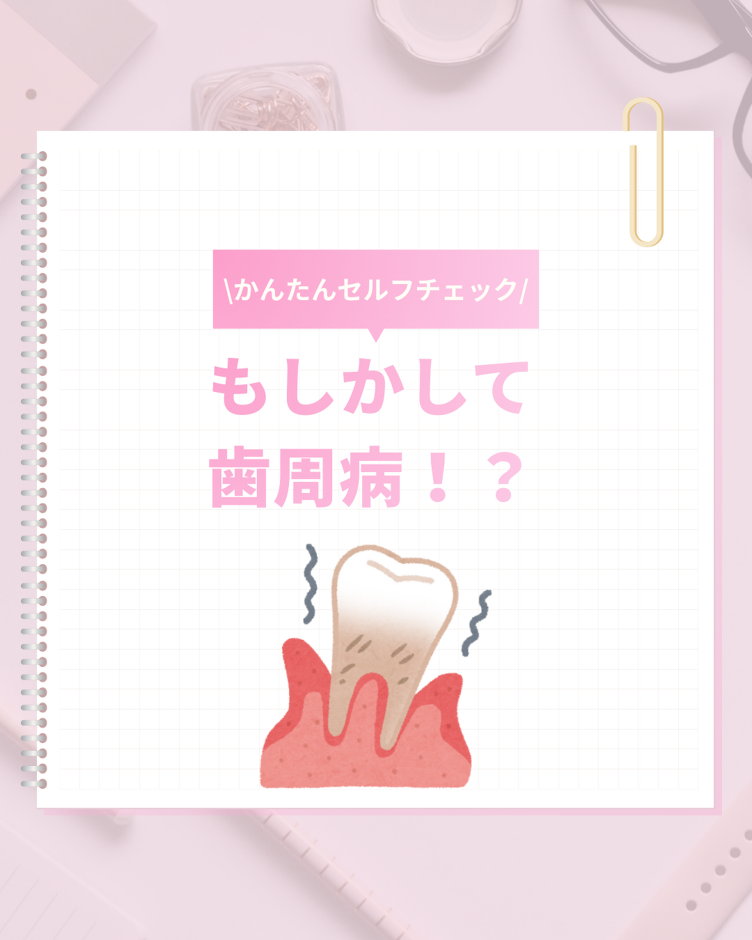 2026年03月14日(土) 歯周病セルフチェック 歯ぐきからの出血、ありませんか?? それ、歯周病のサインかもしれません。 歯周病は「痛みなく進行する」ことが多い病気。 気づいたときには歯を支える骨が溶けていることもあります。 ひとつでも当てはまったら、早めのチェックを✨ 毎日のセルフケア+定期検診が未来の歯を守ります。
