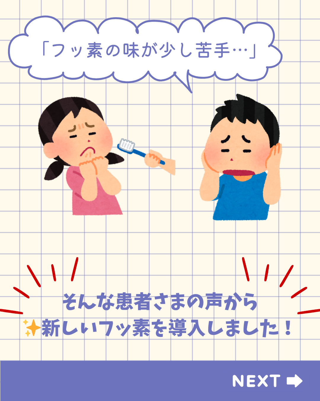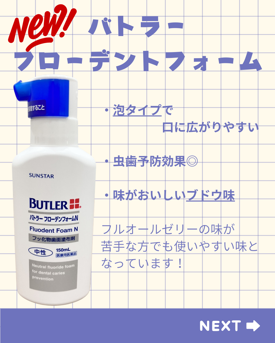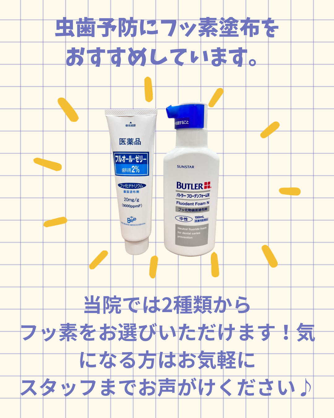 2026年03月26日(木) フッ素の種類が増えました! フッ素ケアの種類が増えました! 当院ではこれまで 「フルオールゼリー」をおすすめしていましたが、 「味が少し苦手…」というお声もあったため、 新しく ✨バトラーの中性フッ素(泡タイプ)✨ を導入しました! 患者さまのお好みに合わせてお選びいただけます☆ 気になる方はお気軽にスタッフまでお声がけください!