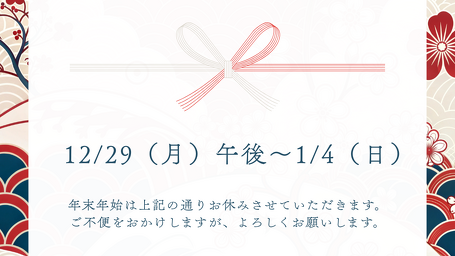 いつもご利用いただき、誠にありがとうございます。 当院におきまして、2025年12月29日(月)午後~2026年1月4日(日)まで年末年始休診とさせていただきます。 なお、2026年1月5日(月)より通常診療になります...